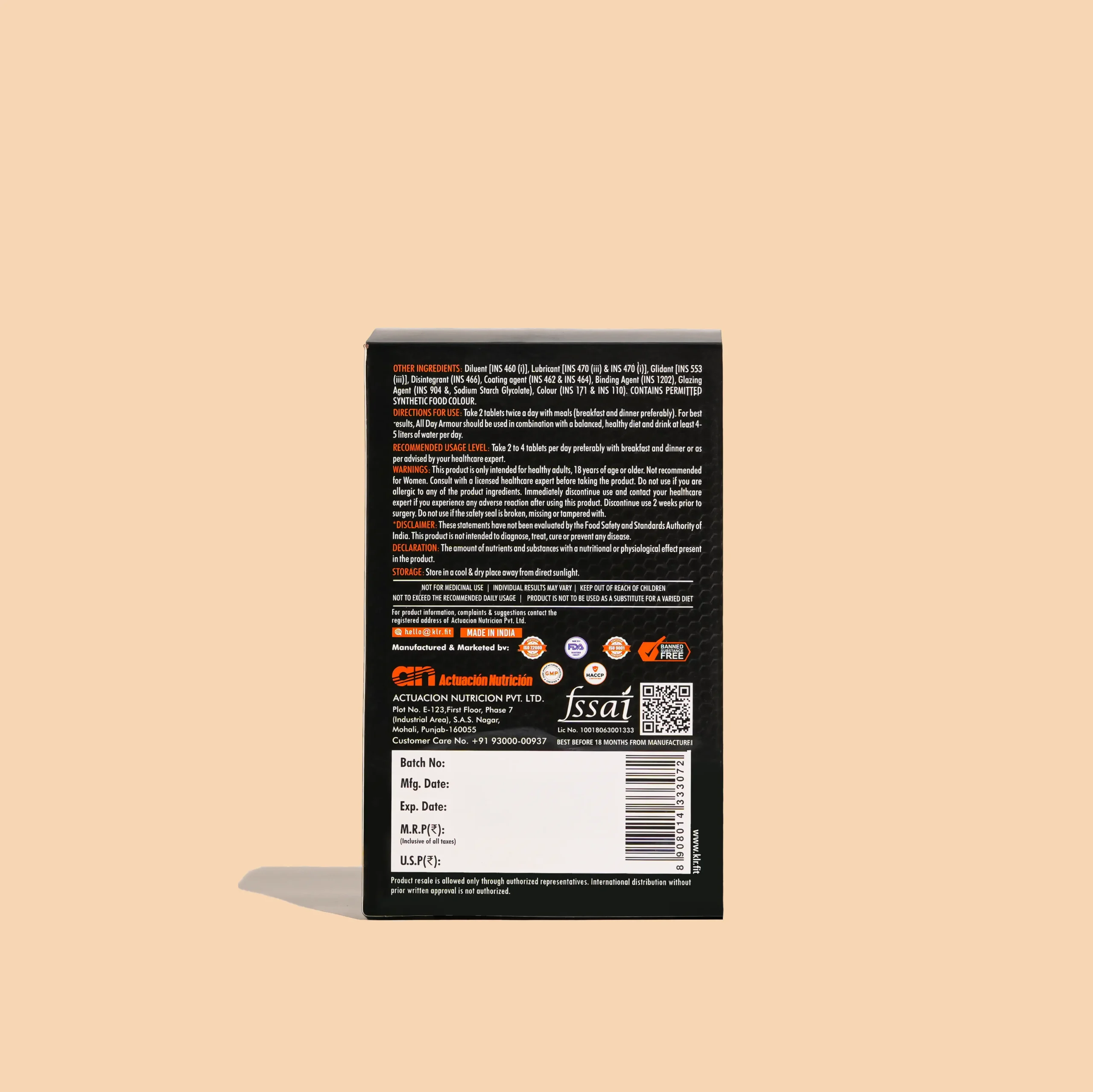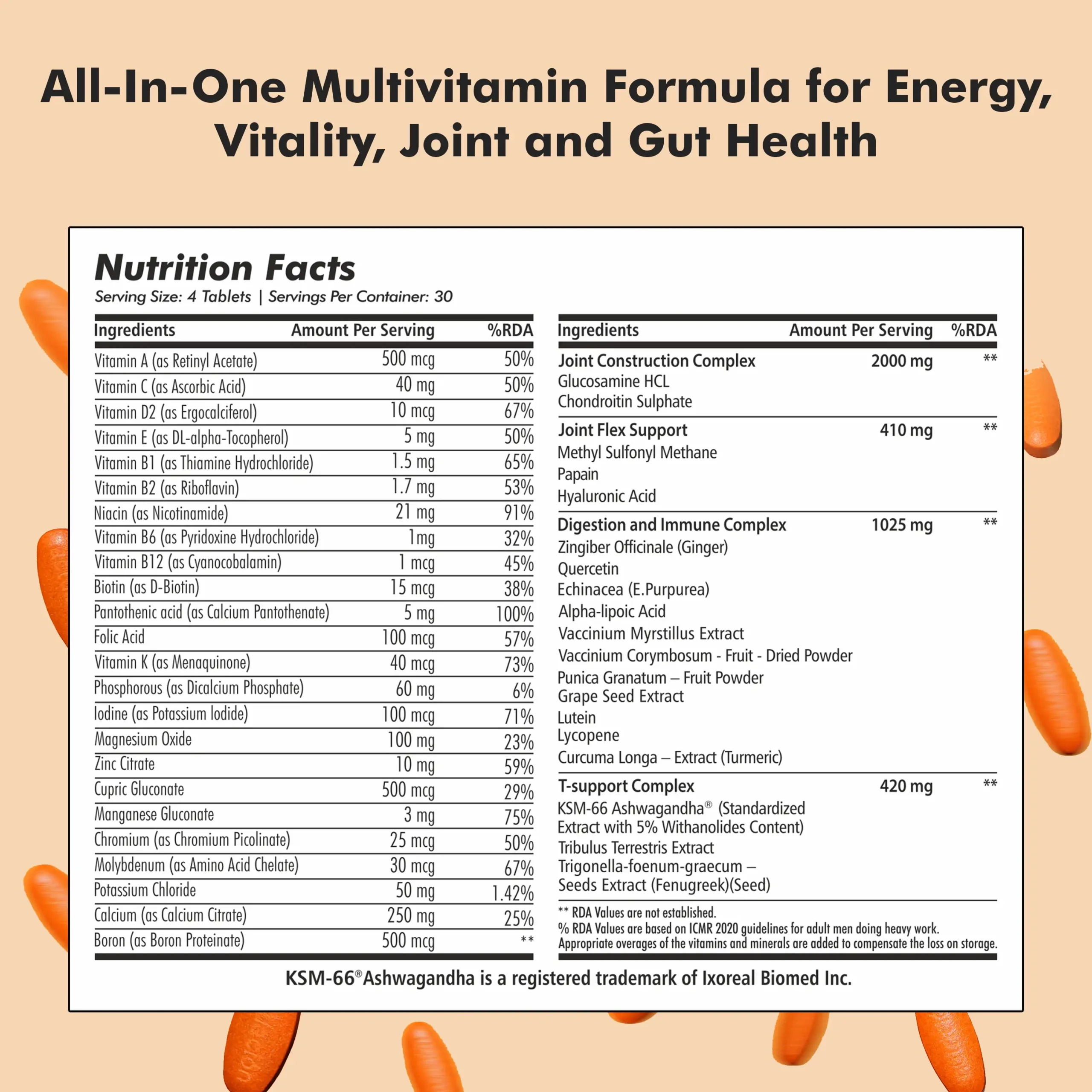 Introducing All Day Armour, A Multivitamin that brings together a blend of vitamins, minerals, and nutrients essential for supporting optimal digestion, immune function, joint health, and T-Level Support. The JOINT CONSTRUCTION and FLEX complexes aim to lubricate joints, strengthen cartilage, and enhance connective tissue resilience. The T-Support Complex contains natural ingredients to boost your T-Levels. Meanwhile, the DIGESTION and IMMUNE complex incorporates natural anti-inflammatories, digestive aids, and nutrient partitioning agents to elevate your performance.