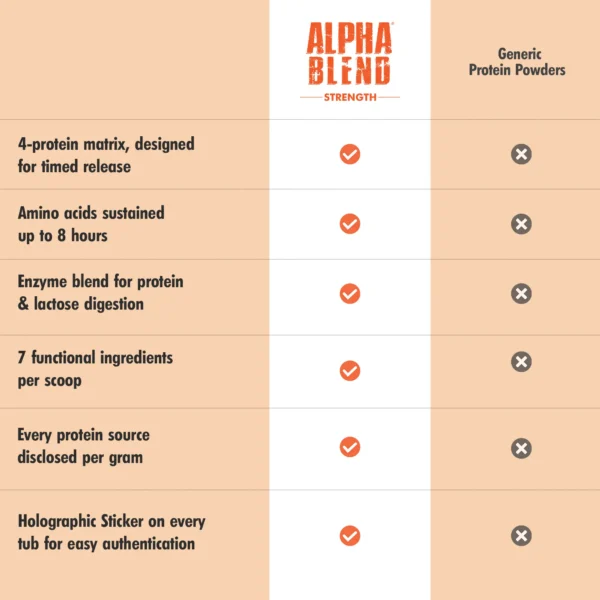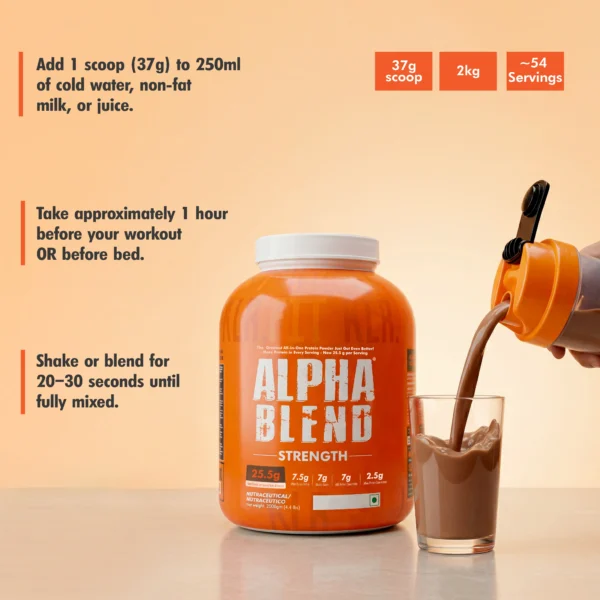 - More Protein in Every Serving – now 25.5 gm per 37 gm of Alpha Blend™ Strength, with 54 Servings per container