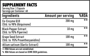 Cardio Q10 doesn’t stop there. Harnessing the antioxidant prowess of Grape Seed Extract standardized to 95% Proanthocyanidins, it shields your cardiovascular system from oxidative stress, a common factor in heart-related concerns.
