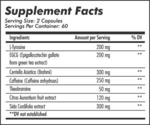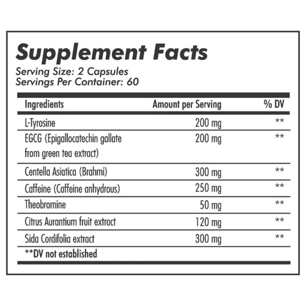 200mg L-Tyrosine || 200mg Green Tea Extract || 250mg Caffeine || 300mg Brahmi || 120mg Bitter Orange