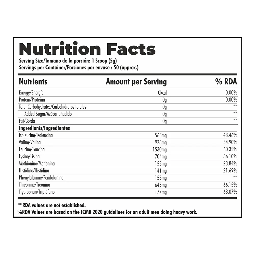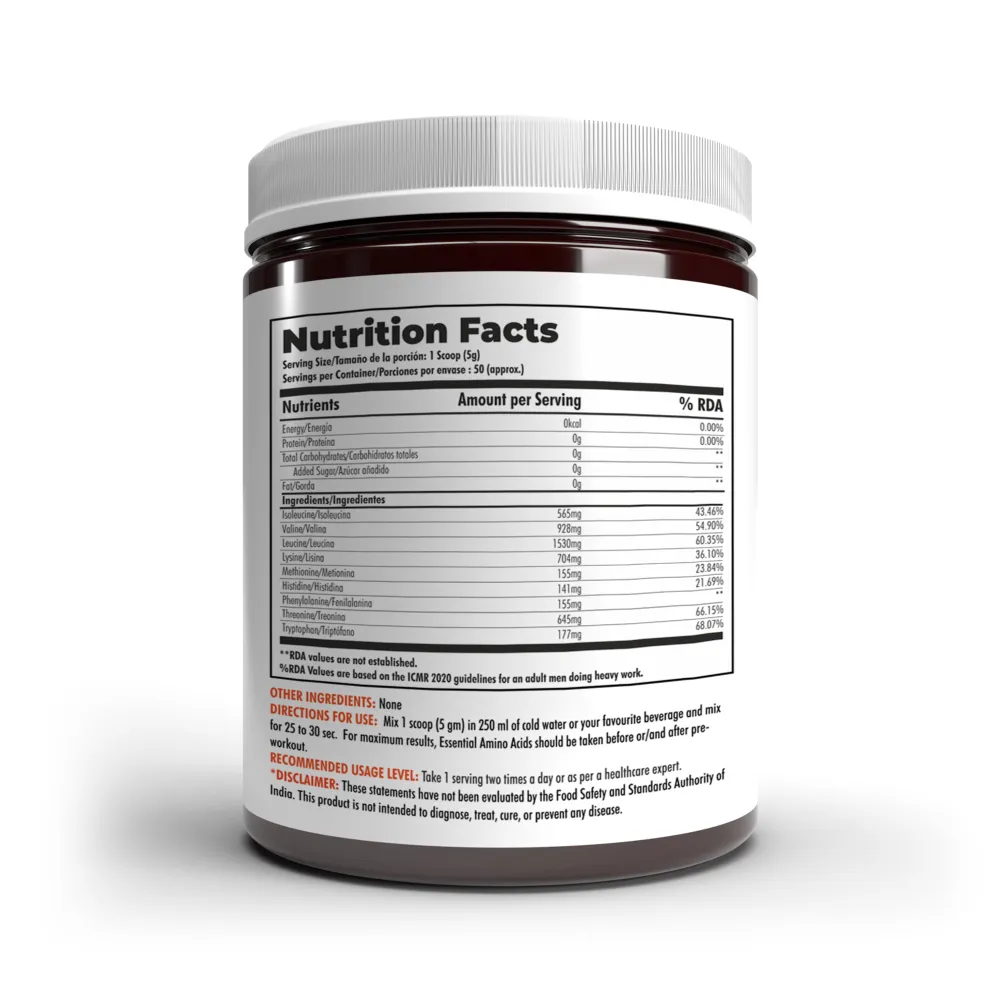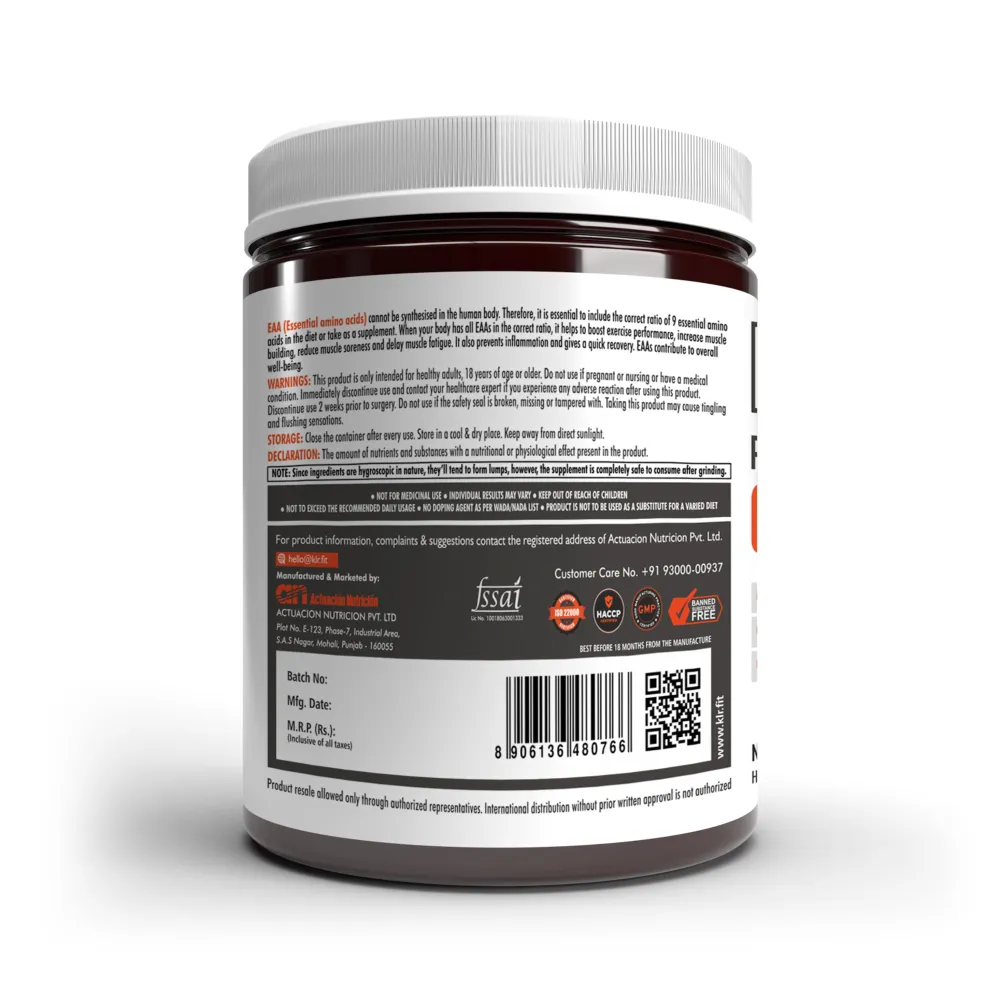 It’s a complete amino-adaptogen matrix that delivers all nine essential amino acids – Isoleucine, Valine, Leucine, Lysine, Methionine, Histidine, Phenylalanine, Threonine, and Tryptophan. Klr.Fit EAA delivers 5g of 9 essential amino acids, It is devised to support muscle protein synthesis, muscle preservation, enhanced training endurance, hydration, and recovery while you are sweating it out at the gym.Klr.Fit EAA contains the full matrix of essential amino acids to support optimal muscle growth. Each Essential Amino Acid has its own benefits to the body, which are listed below: