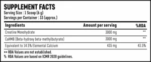 CaHMB (Beta-hydroxy beta-methylbutyrate) (3000mg per serving): Complementing Creatine, our HMB component takes center stage. Known for its ability to minimize muscle protein breakdown, HMB is the secret weapon for muscle preservation and growth. With 3000mg of CaHMB per serving, you’re investing in the most potent form for optimal results.