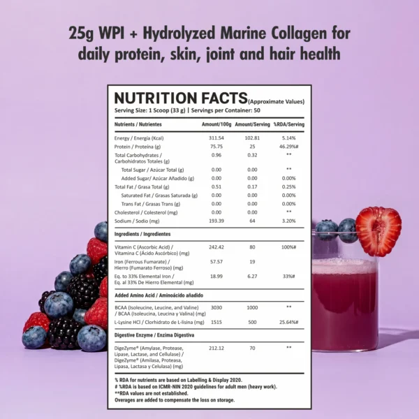 Whey Isolate + Marine Collagen + BCAAs + Enzymes + Iron + Vitamin C.