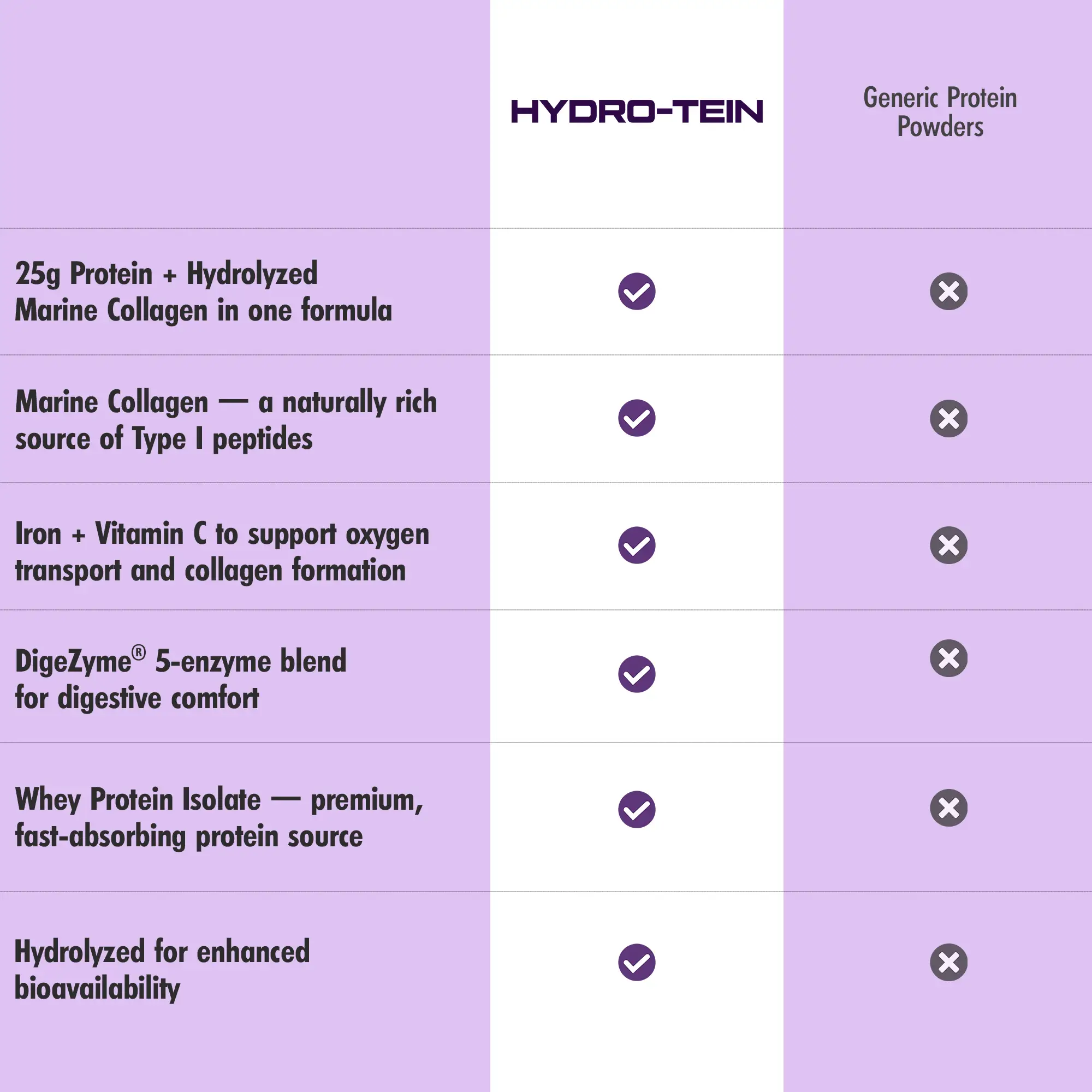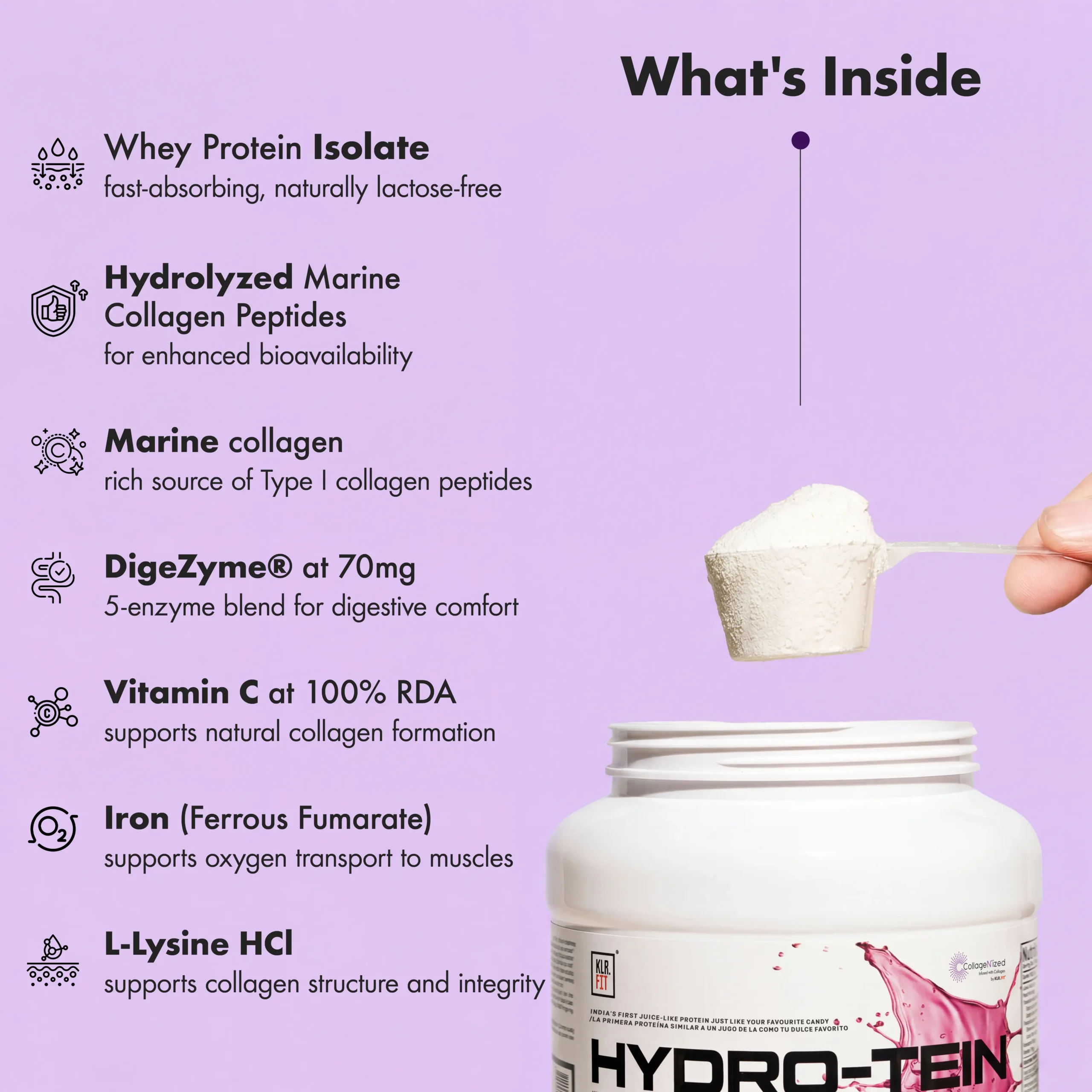 Hydro-Tein is a clinically designed, high-protein formula that delivers 25g of ultra-clean protein per scoop from a unique blend of Whey Protein Isolate and Hydrolysed Marine Collagen. But we didn’t stop at protein — we went deeper into recovery, immunity, digestion, and performance. With added BCAAs, L-Lysine, Iron, Vitamin C, and a full-spectrum DigeZyme® enzyme complex, this is next-generation recovery fuel.