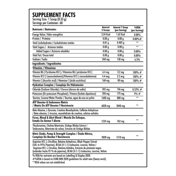 Mix 1 Scoop (8.33g) in 125ml of cold water and shake well before use. Take 20-30 minutes before workout. Drink at least 3-4 litres of water while using this product.