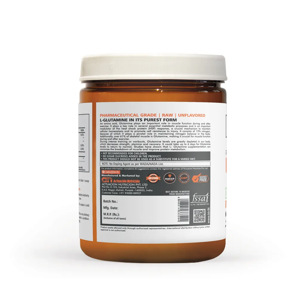 During intense training or workouts, Glutamine levels are greatly depleted in our body, which decreases strength, stamina and recovery. It could take up to 6 days for Glutamine levels to return to normal. Studies have shown that L-Glutamine supplementation can minimize breakdown of muscle and improve protein metabolism.