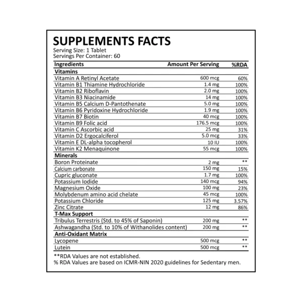 Comprehensive Wellness: A meticulously crafted blend of vitamins, minerals, and targeted ingredients for holistic men’s health.