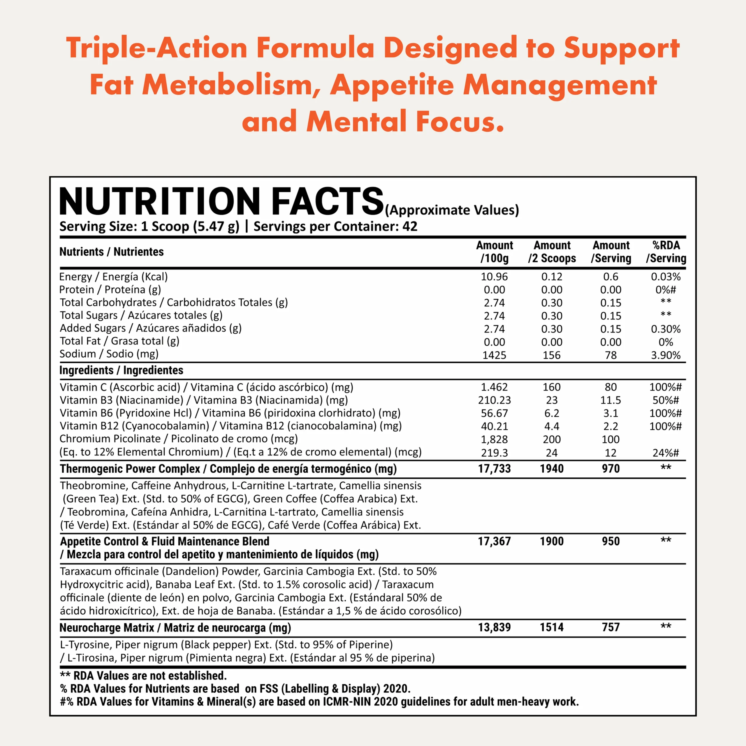 Two smaller servings across the day maintains more consistent thermogenic and appetite-controlling activity than one large dose. A single large serving spikes stimulant levels sharply and fades — two servings keep the system active across a longer window, which is a more effective fat-burning state to sustain throughout the day.