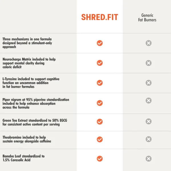 Generic fat burners target one mechanism — usually thermogenesis through caffeine. Shred.Fit addresses three simultaneously: it activates thermogenesis, controls appetite and blood sugar-driven cravings, and supports mental focus during caloric deficit. That third mechanism — the Neurocharge Matrix — is what cheap products skip entirely, and it’s often the difference between staying consistent and falling off.