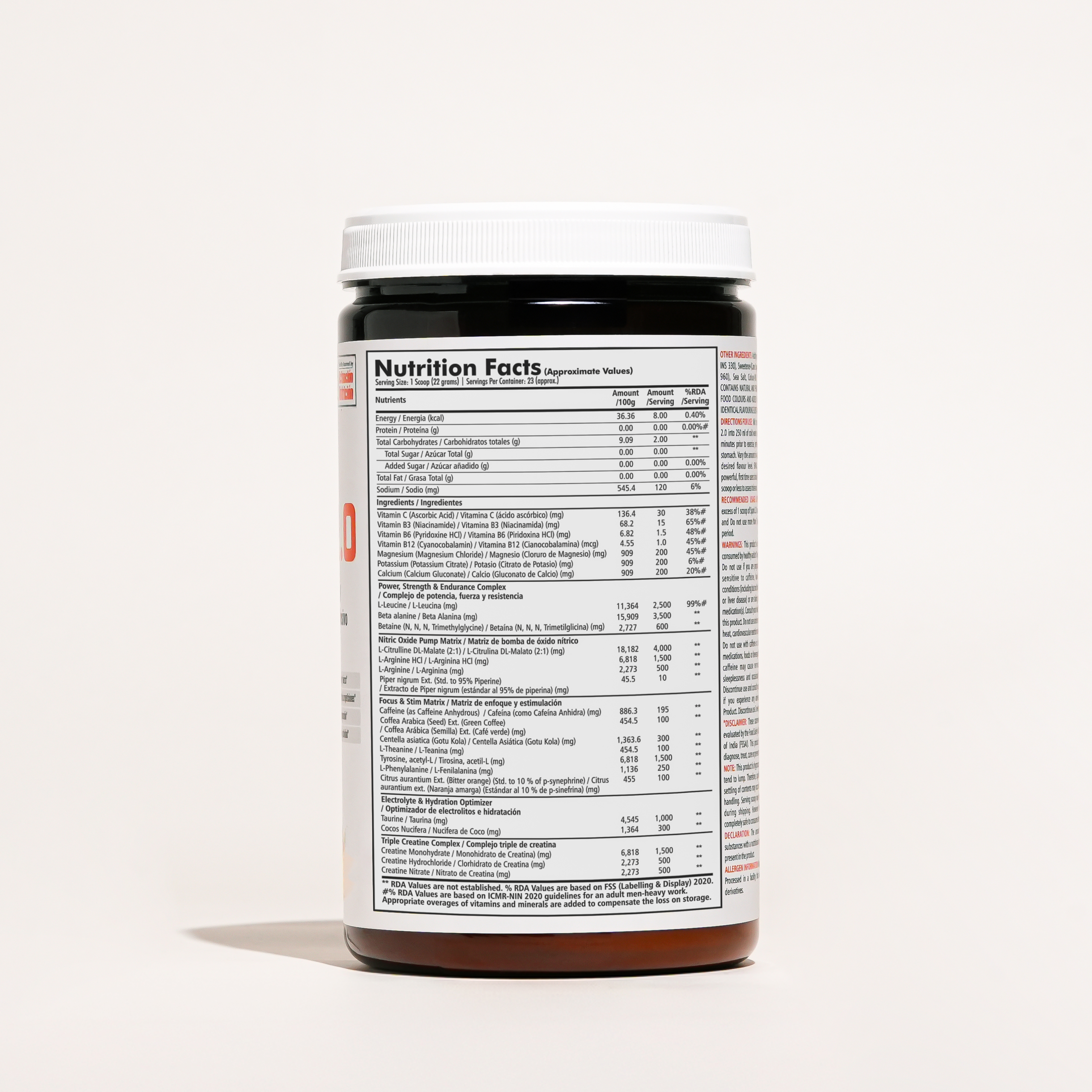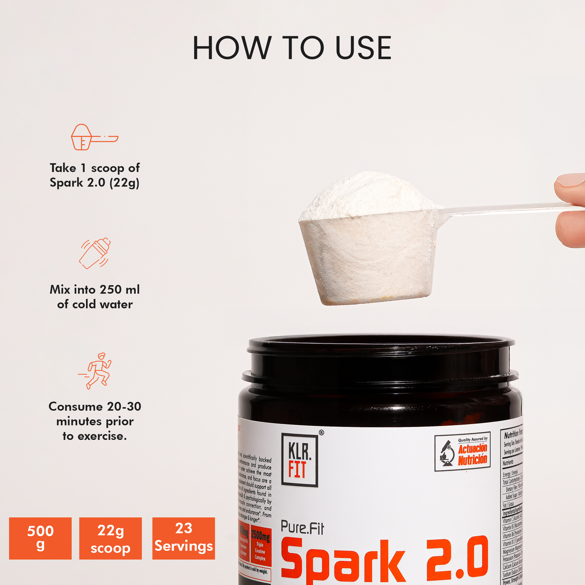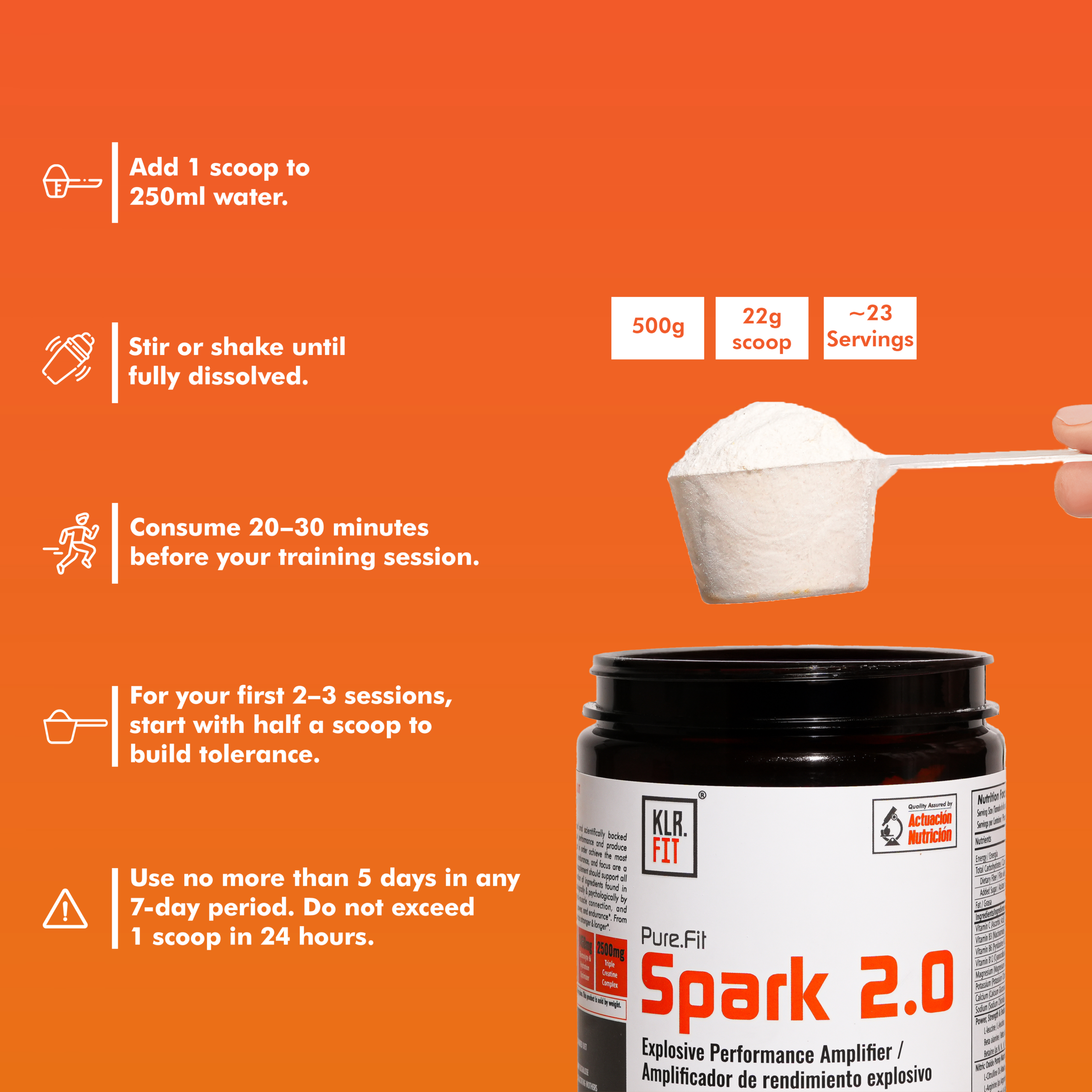 As a dietary supplement, mix 1 scoop of Spark 2.0 into 250 ml of cold water and consume 20-30 minutes prior to exercise, preferably on an empty stomach. Vary the amount of water to achieve your desired flavour level. It is extremely powerful, first time users should begin use with 1/2 scoop or less to assess tolerance.